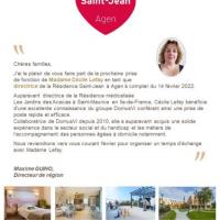 Publiée le 27/01/2022Chères familles, J'ai le plaisir de vous faire part de la prochaine pris de fonction de Madame Cécile Lefay en tant que directrice de la Résidence Saint-Jean à Agen à compter du 14 février 2022. Auparavant directrice de la Résidence médicalisée Les Jardins des Acacias à Sainte-Maurice en Île-de-France, Cécile Lefay bénéficie d'une excellente [...] Lire la suite